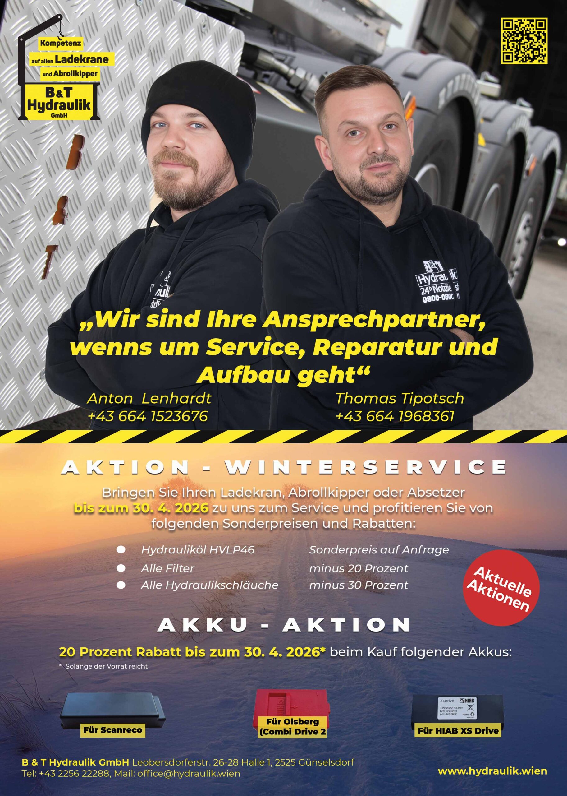 Bei der B & T Hydraulik GmbH ist ein Team aus Fachleuten für Reparatur und Service von Kränen, Kippern und deren Komponenten zuständig. Rufen Sie uns an, wenn Probleme wie Krafteinbußen oder verminderte Funktion von hydraulischen Anlagen auftreten. Mit unserem großen Ersatzteillager können wir Reparaturen von Schäden oder Verschleiß rasch durchführen. Für Instandsetzung kommen wir in Niederösterreich gerne zu Ihnen vor Ort oder Sie besuchen uns in unserer Werkstätte in Günselsdorf in NÖ. Nutzen Sie unseren Hol- und Bringservice kostenlos.